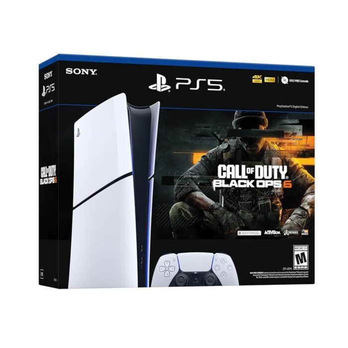 Tipo de consola: Digital Edition (sin lector de discos)., Procesador (CPU): AMD Ryzen “Zen 2”, 8 núcleos / 16 hilos, hasta 3.5 GHz., Gráficos (GPU): AMD RDNA 2, con Ray Tracing, hasta 2.23 GHz, ~10.3 TFLOPS., Memoria RAM: 16 GB GDDR6 (448 GB/s). Audio: Tempest 3D AudioTech para sonido envolvente., Video/Salida: HDMI 2.1, resolución hasta 4K 120 Hz, compatible con 8K y VRR., Conectividad: Wi-Fi 6, Bluetooth., Dimensiones: 358 × 80 × 216 mm aprox. (versión Digital Slim)., Peso: 2.6 kg aprox., Contenido del bundle: Consola PS5 Digital, control inalámbrico DualSense, juego Call of Duty: Black Ops en versión digital.