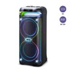 Modelo: TORRBL8INF, Tipo: Torre de sonido / parlante de torre, Potencia: 50 W, Parlantes: 2 de 8 pulgadas (2×8″), Conectividad: Bluetooth, Radio: FM, Funciones: DSP (sonido espacial), TWS (emparejamiento con otra torre), Karaoke, Reproductor MP3: Sí, Entradas: USB (1 puerto), entrada auxiliar (AUX), Canales de audio: 3, Luces: Sí, iluminación integrada, Control remoto: Incluido, Resistencia al agua: No